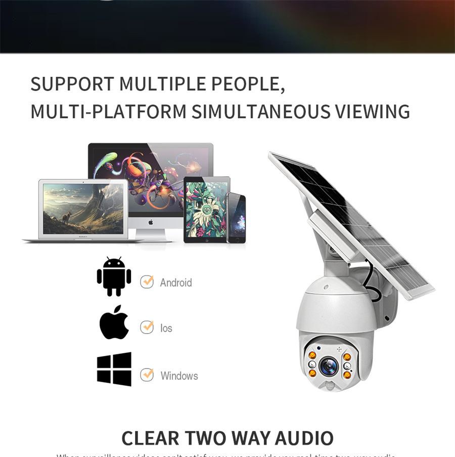 3. 1080P Full HD--Αυτή η 2MP HD αδιάβροχη ηλιακή κάμερα PTZ έχει 1920*1080P (φακός HD 2 Megapixel) Υψηλή ανάλυση, εικόνα full HD για μέρα και νύχτα, περισσότερες λεπτομέρειες για την εικόνα. Ο ενσωματωμένος αισθητήρας εικόνας CMOS, οι προηγμένοι αλγόριθμοι και τα τσιπ βελτιώνουν το οπτικό πεδίο και καλύπτουν μεγαλύτερο εύρος. Μπορείτε να απολαύσετε πιο καθαρή όραση και εγγραφές βίντεο από κάμερα ασφαλείας 720P.